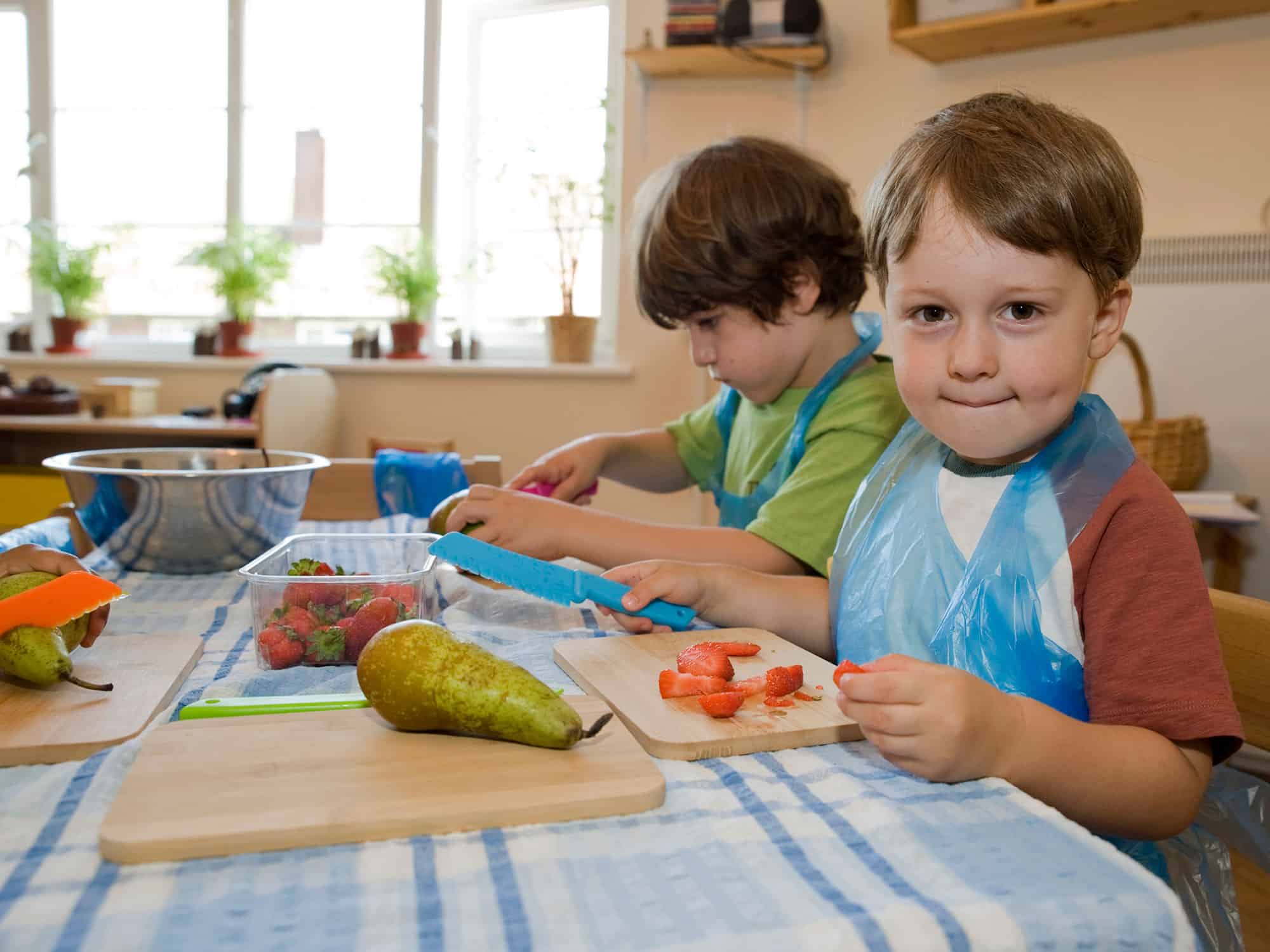 The 2 year olds and over help to lay the tables for lunch using table cloths and crockery in a family style, and will serve themselves.